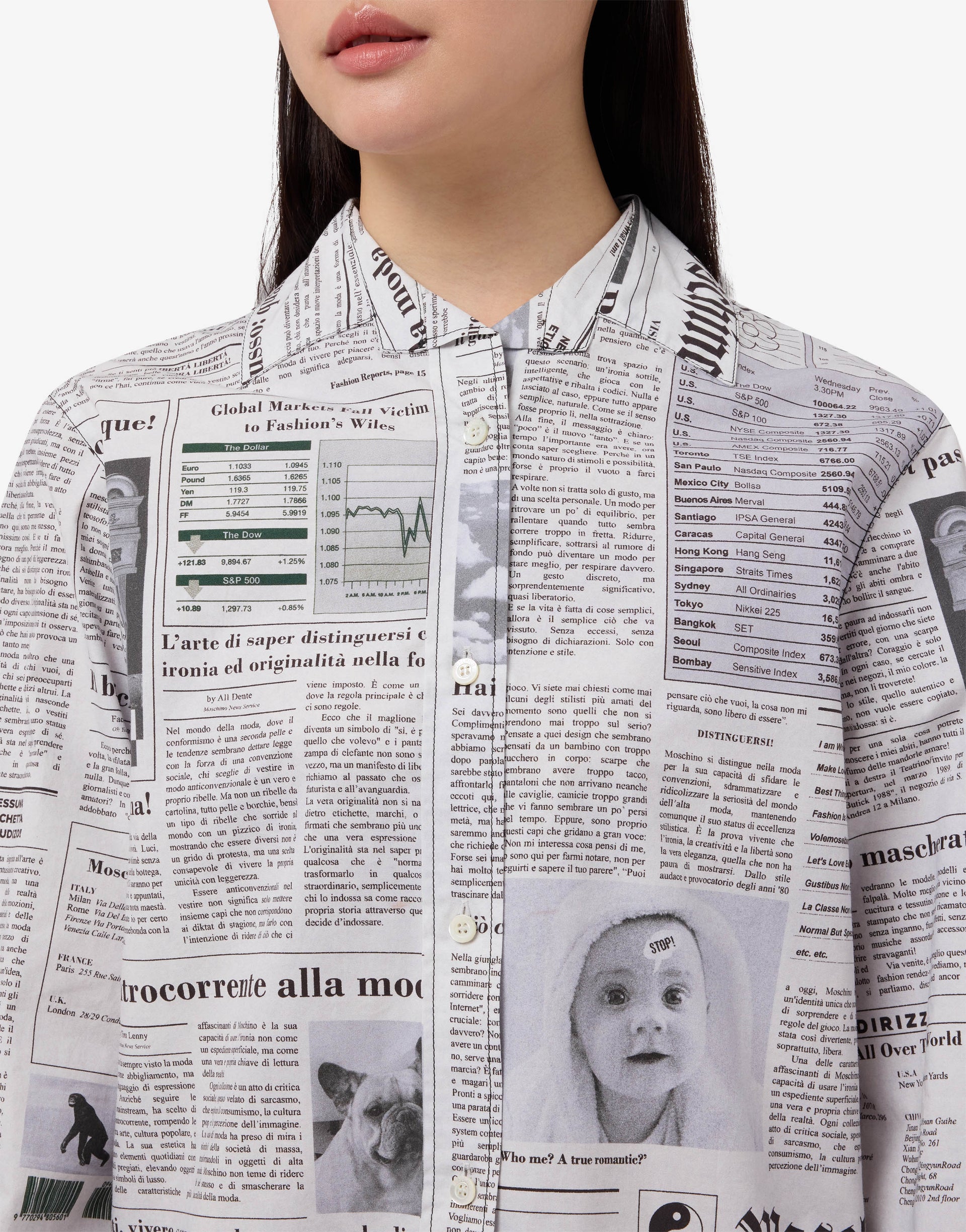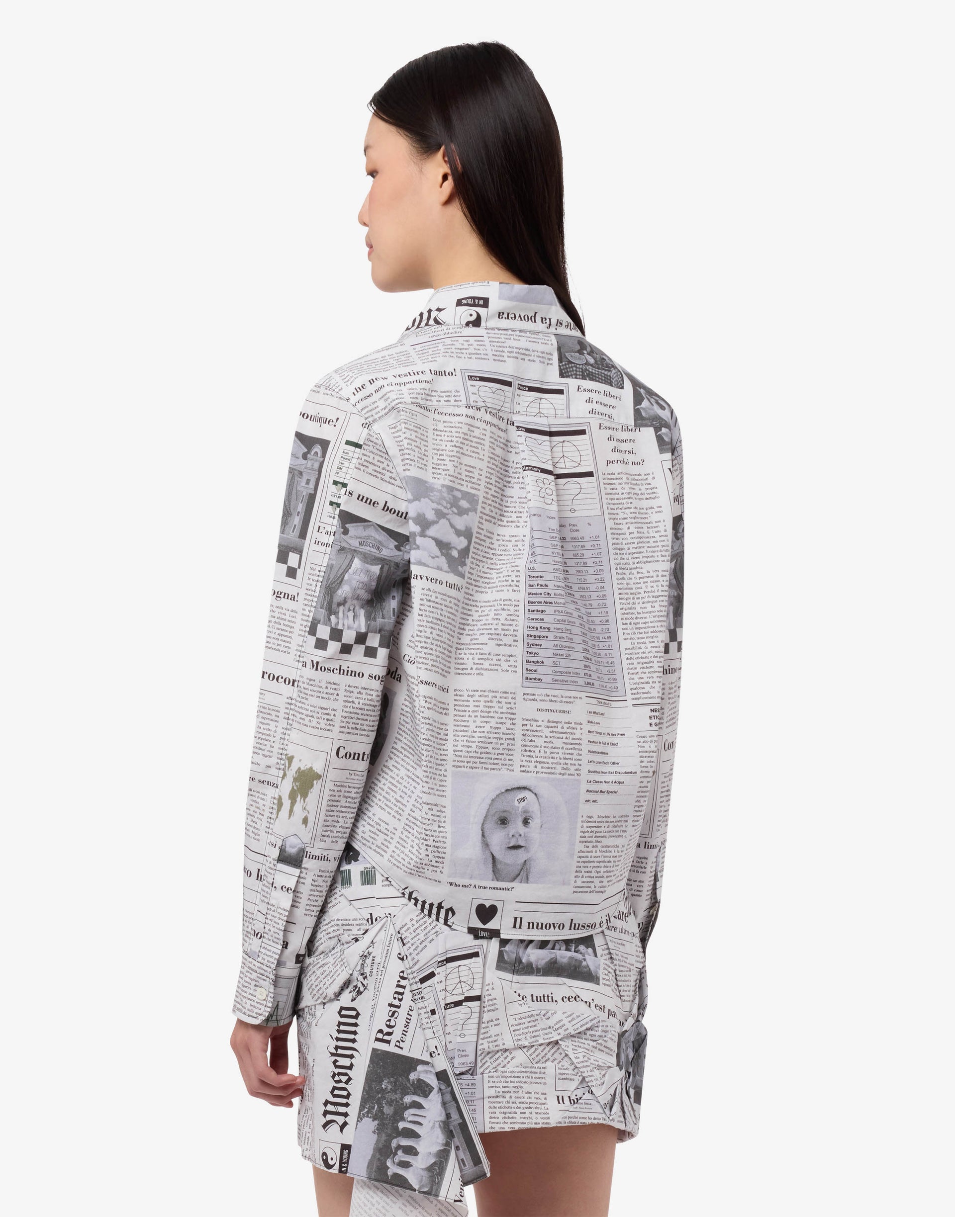 Die Frühjahr/Sommer-Kollektion 2026 präsentiert das Hemd aus Baumwollpopeline mit durchgehendem Zeitungsdruck.