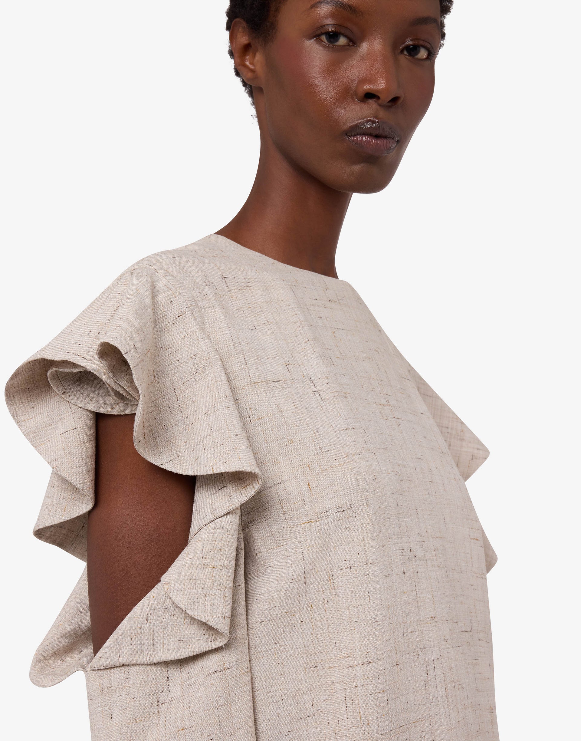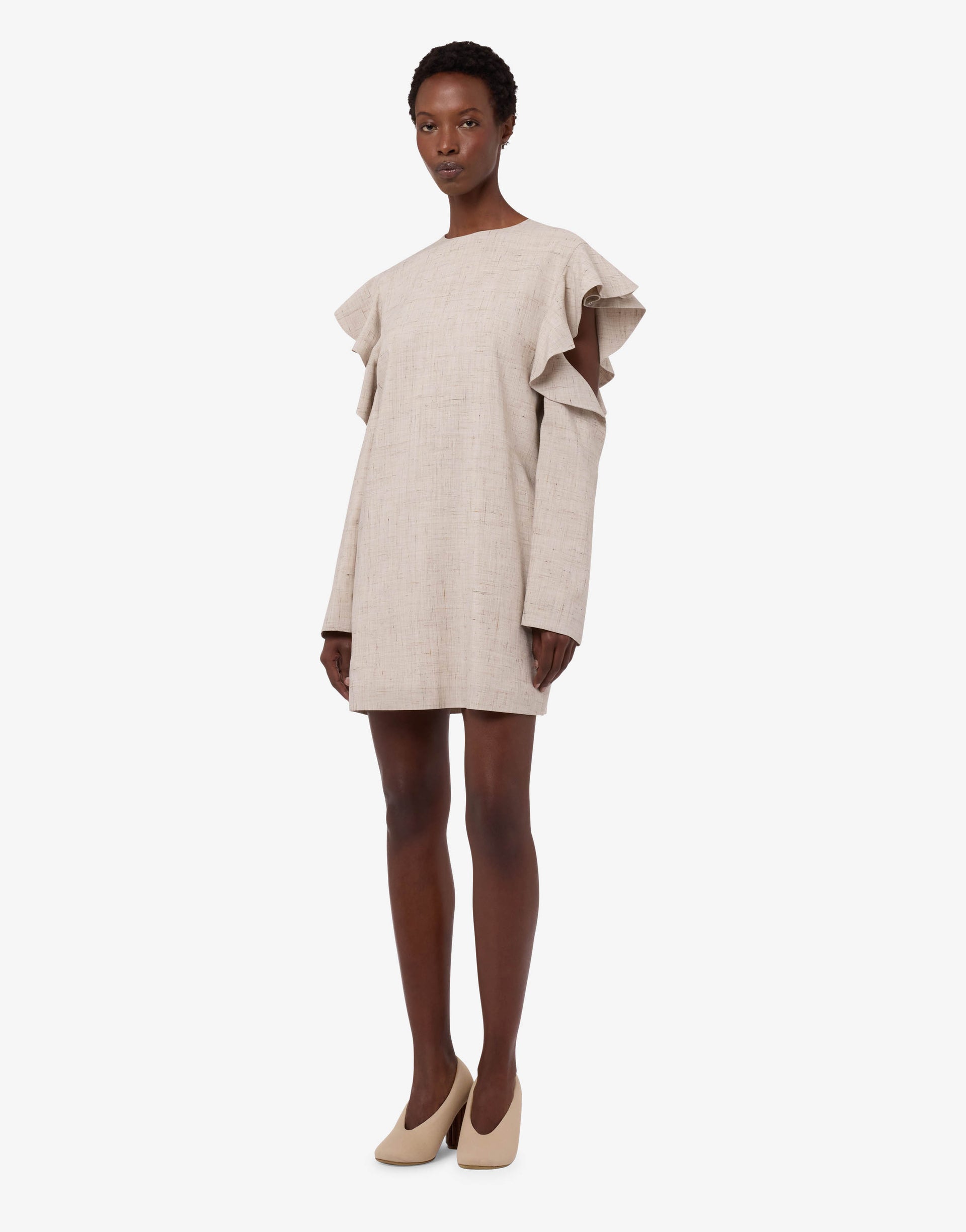 Die Frühjahr/Sommer-Kollektion 2026: Das Tweedkleid mit Cut-Out-Ärmeln und Rüschen an den Armausschnitten.