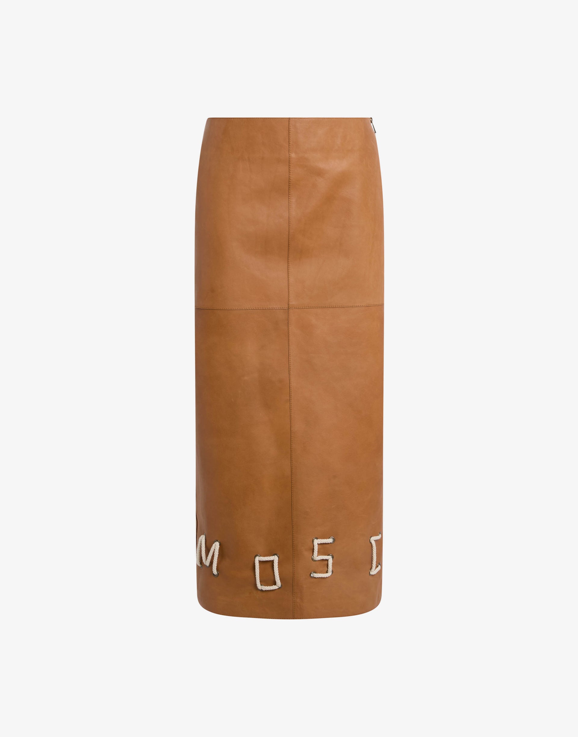 The Spring/Summer 2026 collection features a leather midi pencil skirt with logo detailing at the hem, created using a cord threaded through metal eyelets.