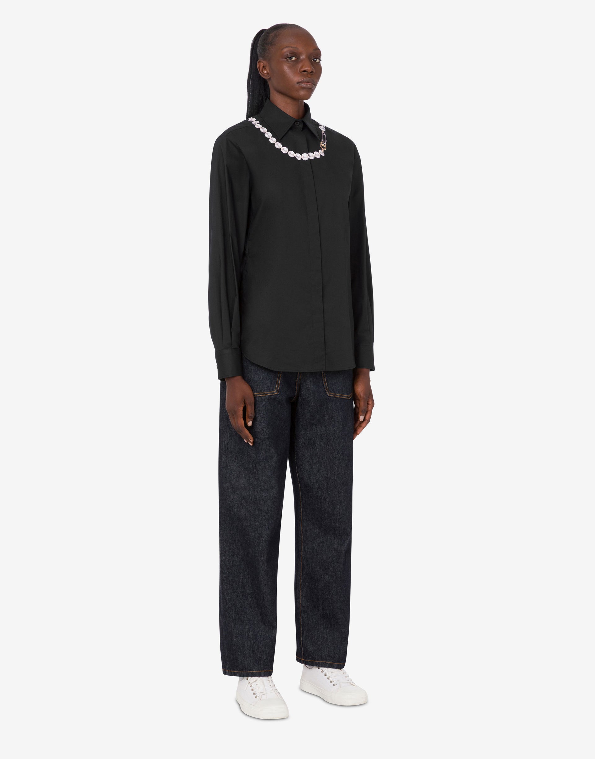 The Resort 2026 collection features the stretch cotton poplin shirt with a pearl necklace print with a trompe-l'œil effect.