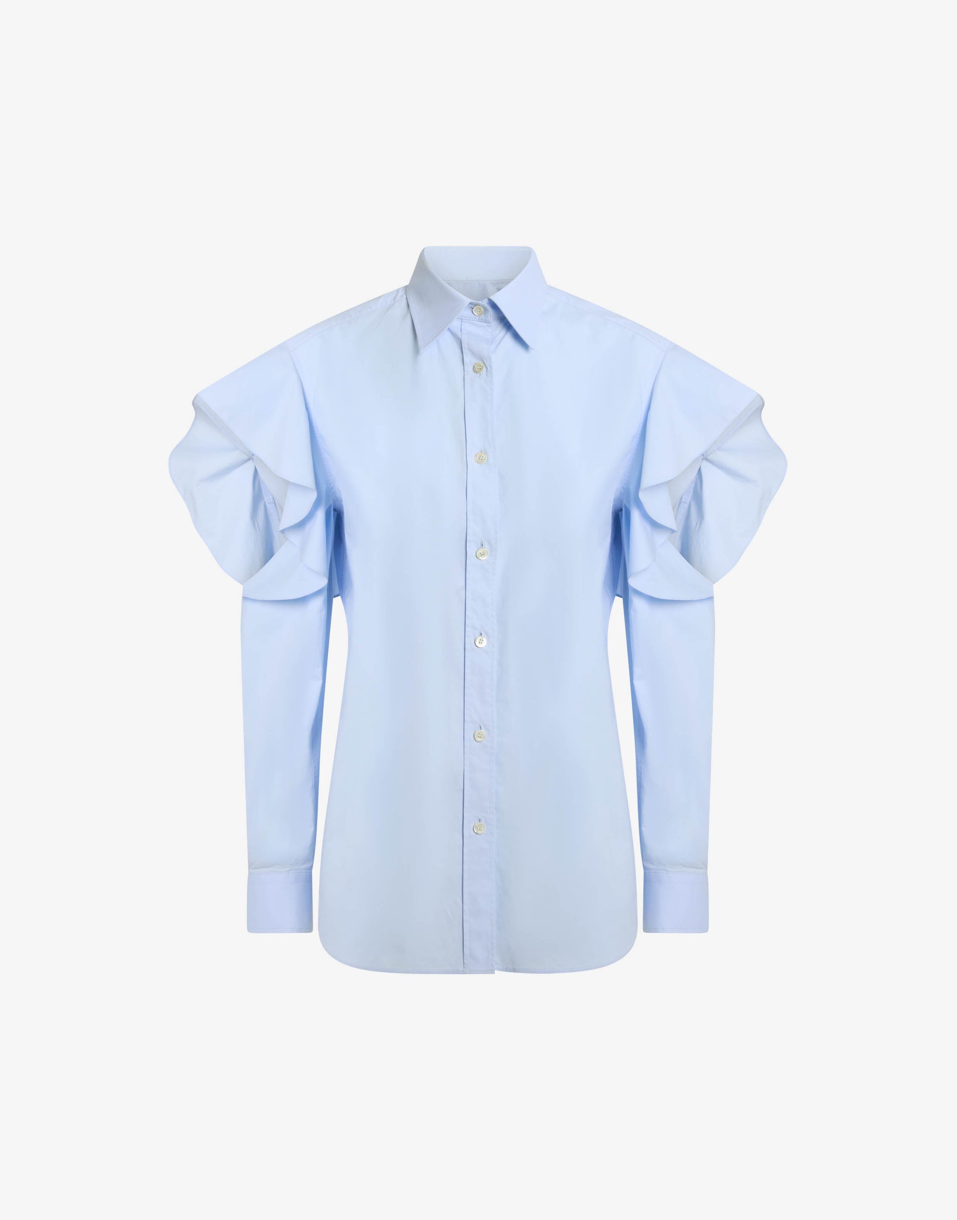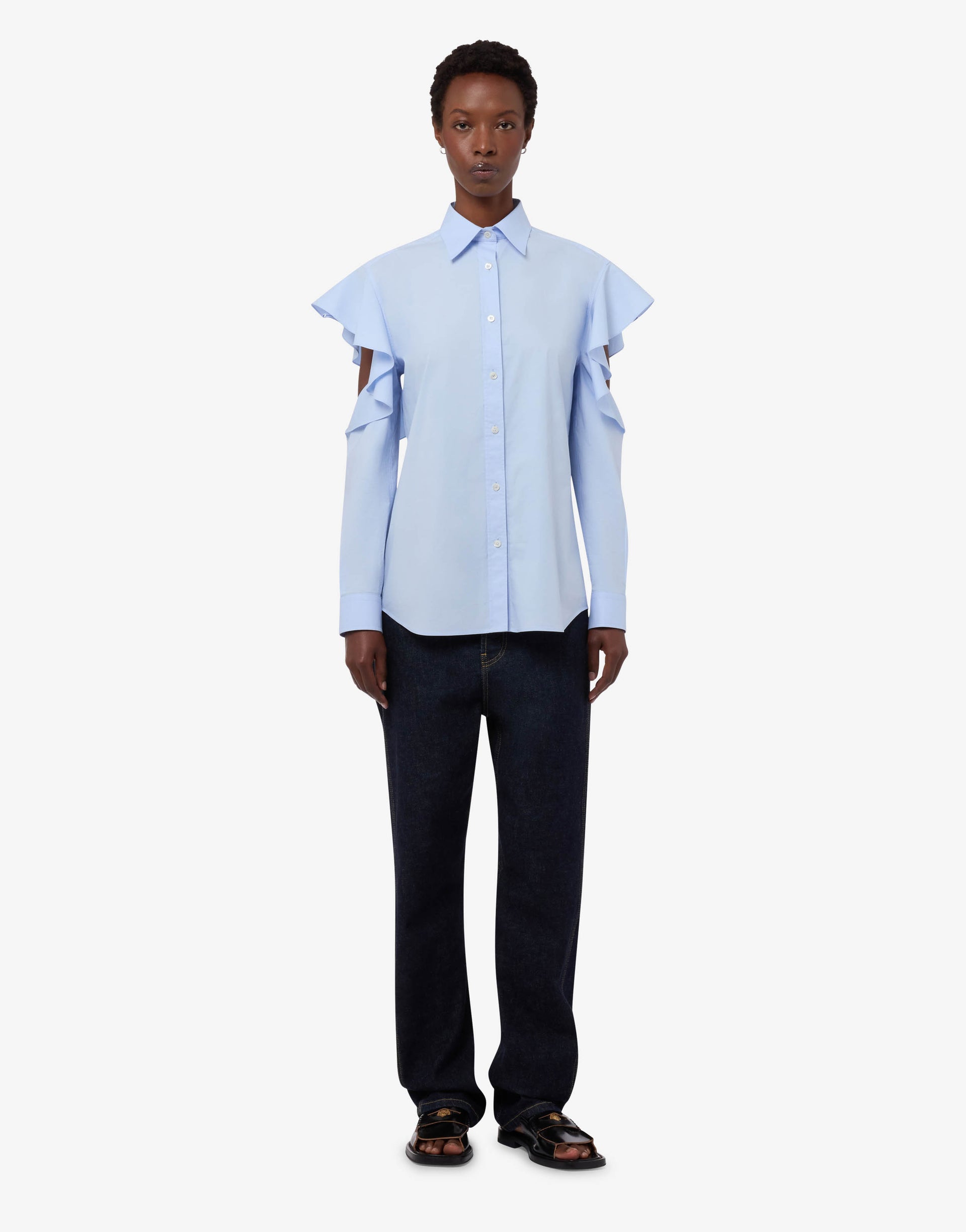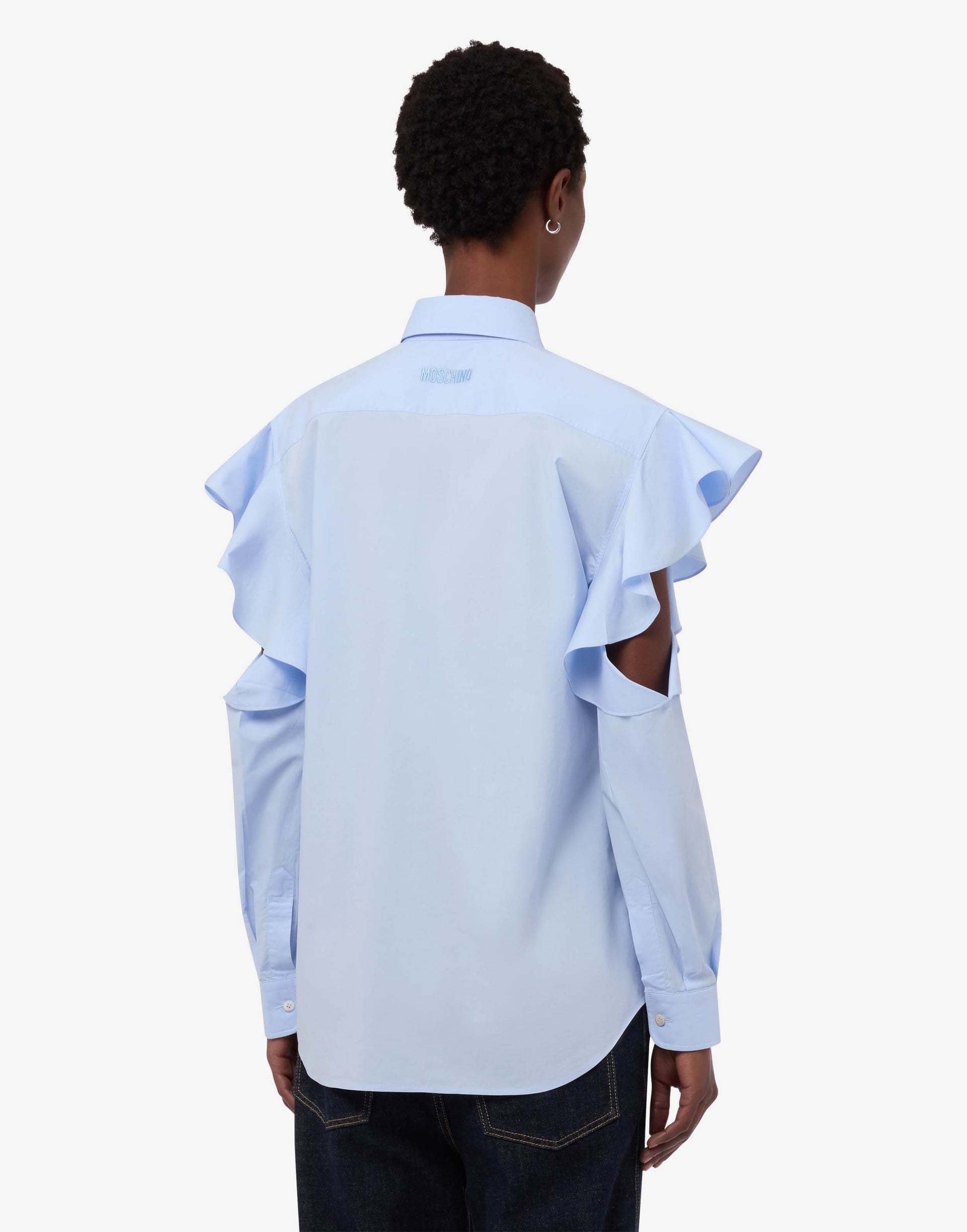 The Spring/Summer 2026 collection features a stretch cotton poplin shirt with cut-out sleeves, ruffles at the armholes, and jacquard logo embroidery on the back.