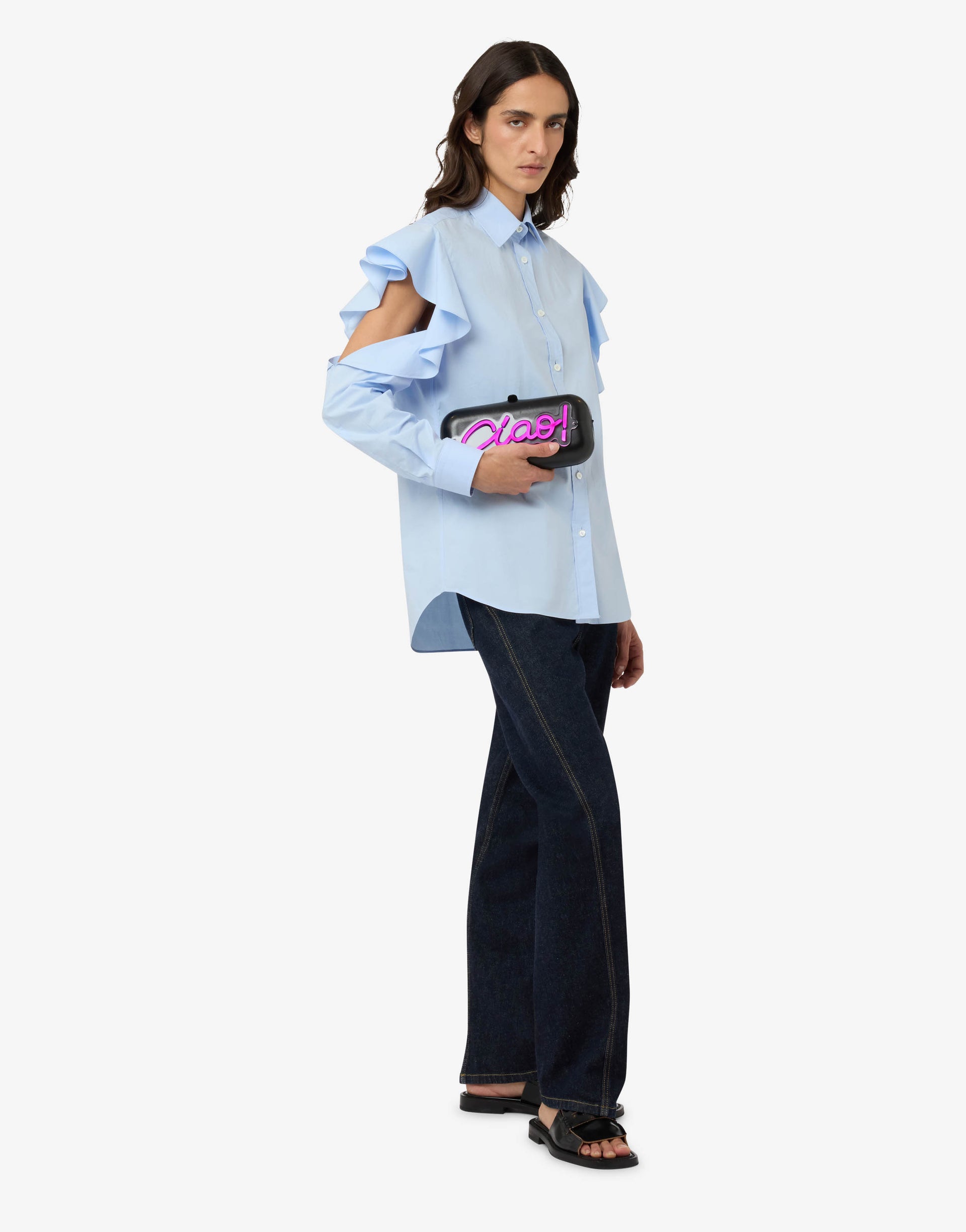 The Spring/Summer 2026 collection features the Ciao! rigid clutch bag with LED lighting on the front, powered by hidden batteries and an on/off switch discreetly positioned inside the bag.