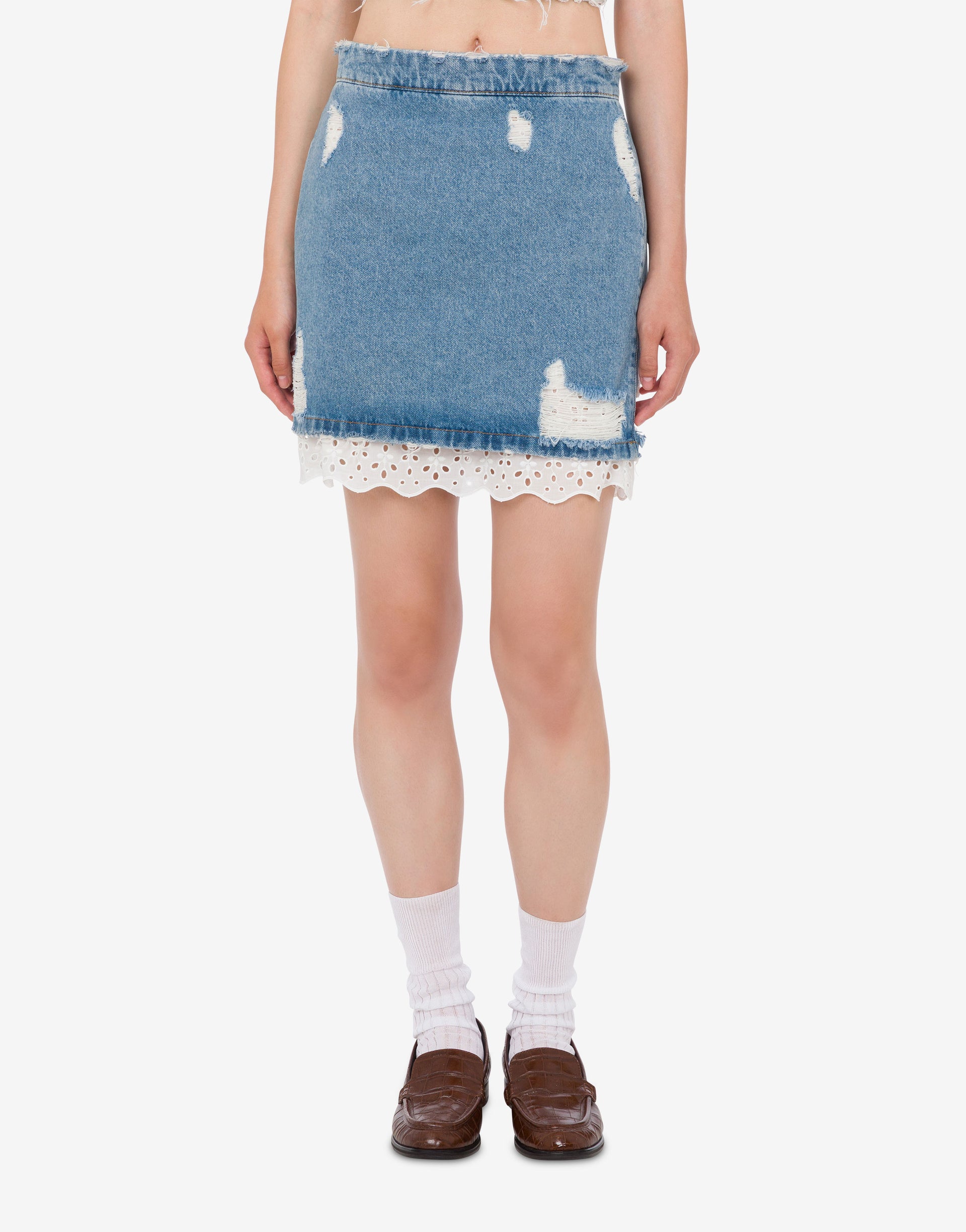 The Spring/Summer 2026 collection features a cotton denim miniskirt with specially created white rips and a broderie anglaise embroidered lining.
