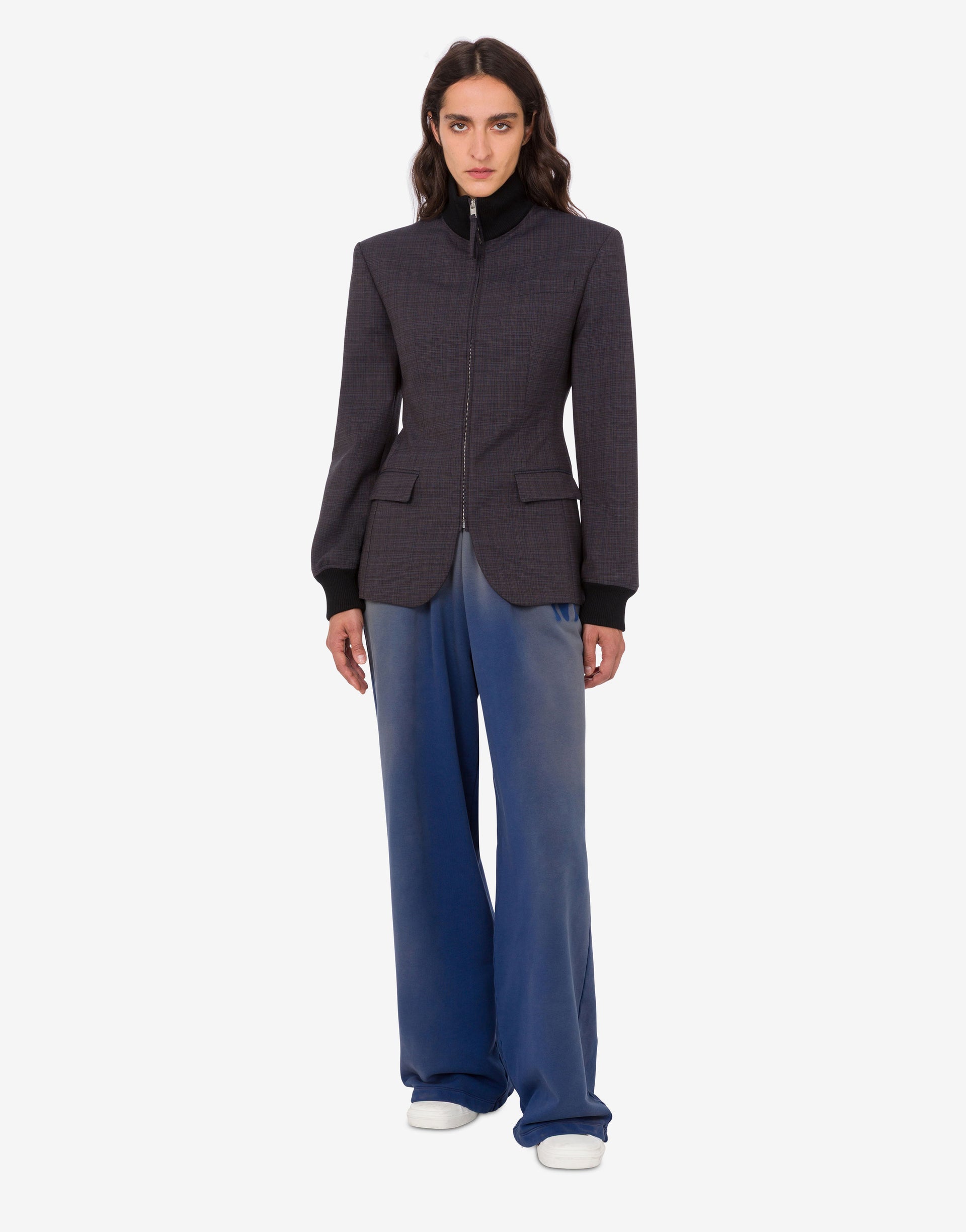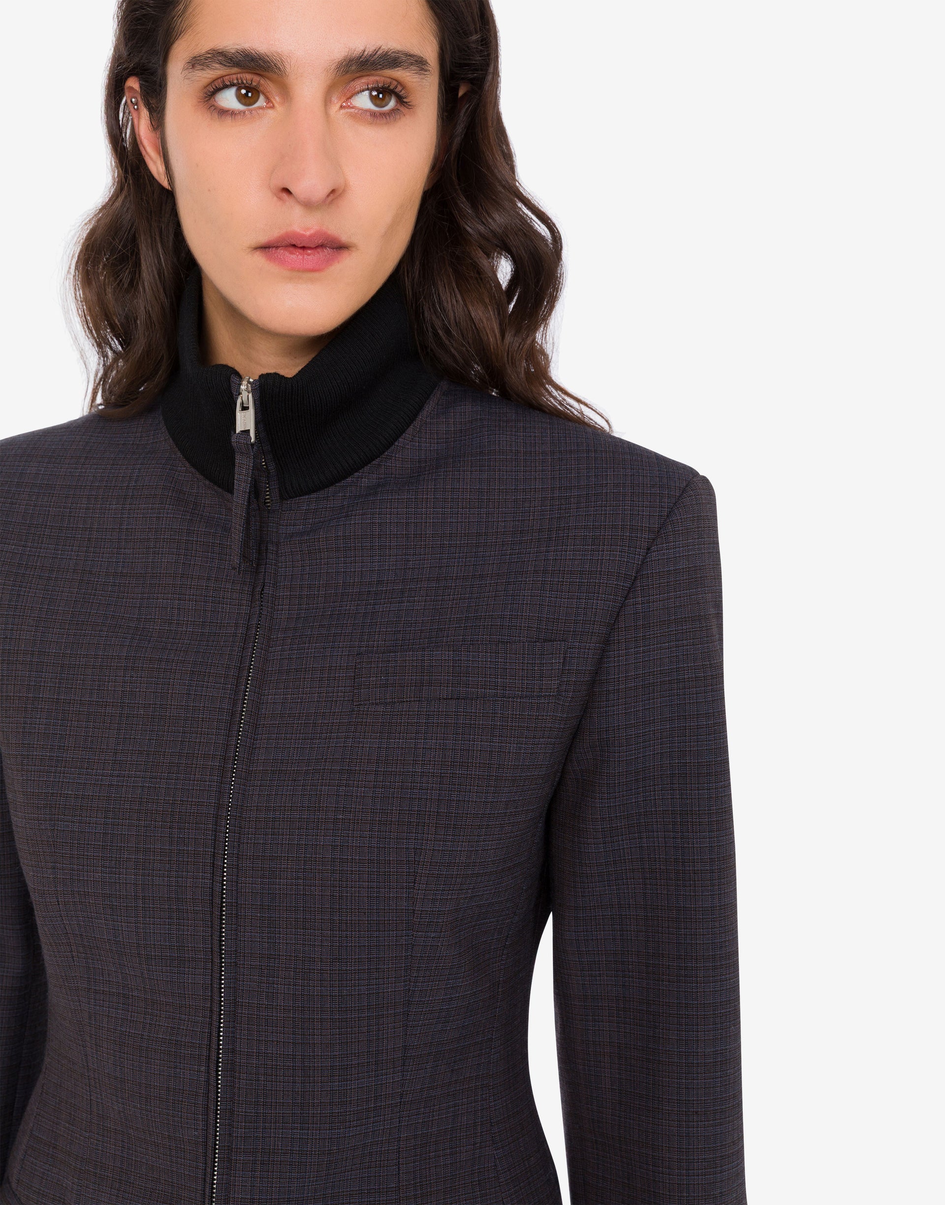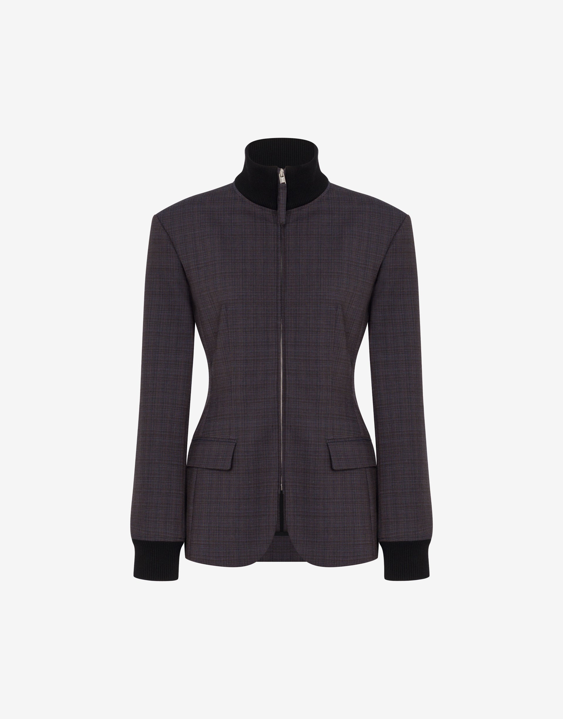 The Resort 2026 collection features the stretch wool-blend cloth jacket with a high collar and contrasting ribbed cuffs.