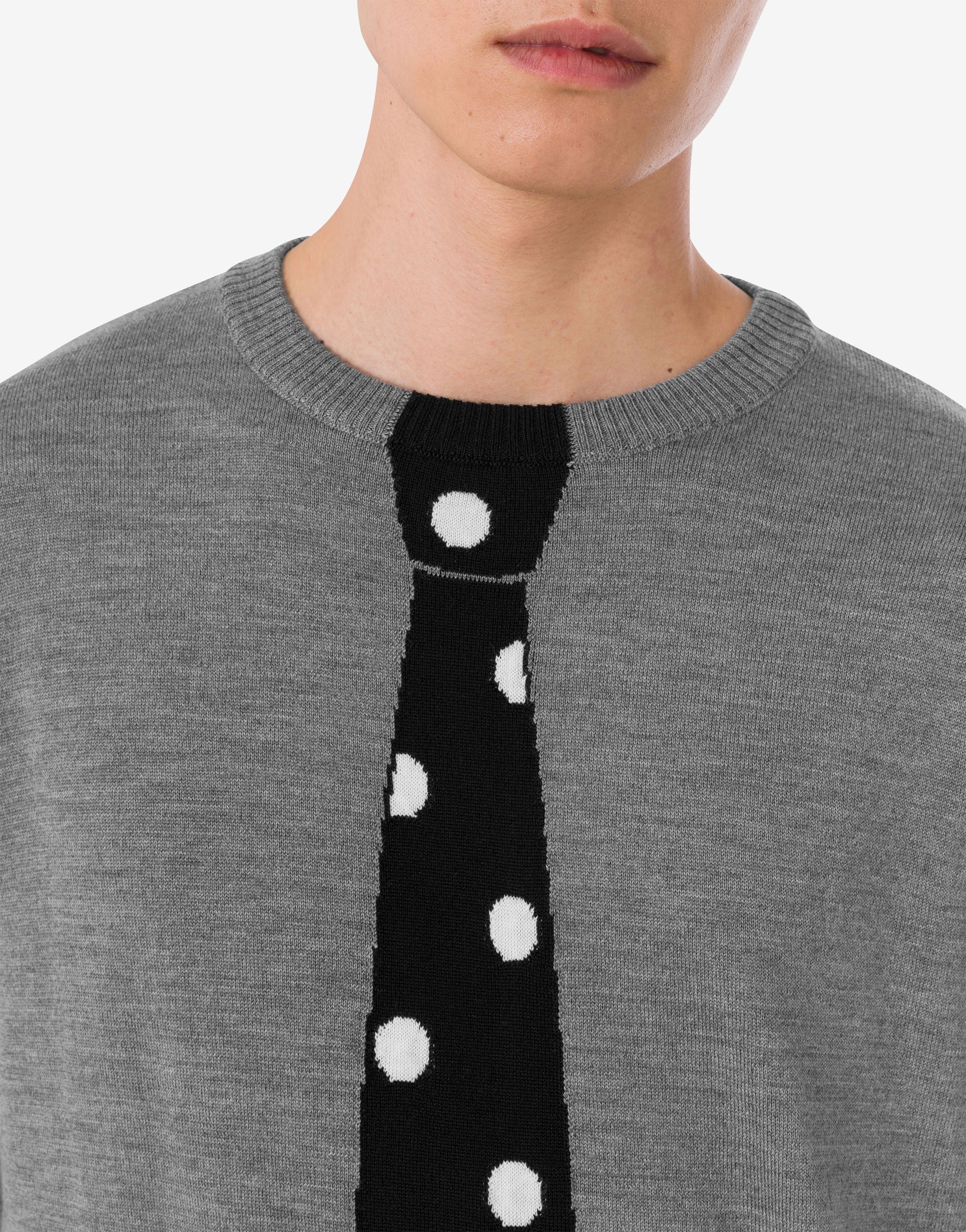 The Spring/Summer 2026 collection presents an extra-fine merino wool pullover with intarsia in the shape of a tie with a polka dot pattern.