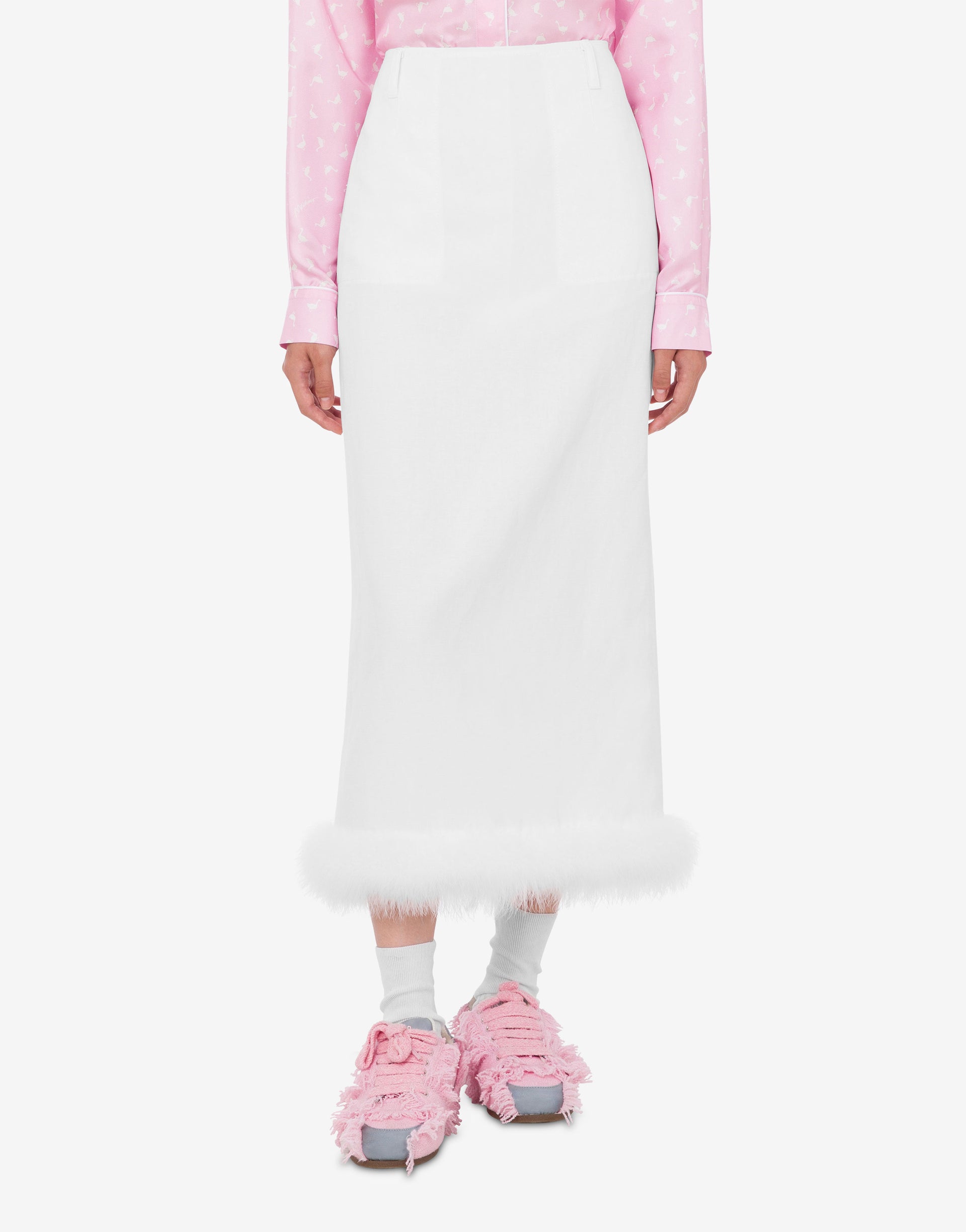 La colección Resort 2026 presenta una falda recta en mezcla de lino teñida en hilo y decorada con plumas de marabú en el bajo.
