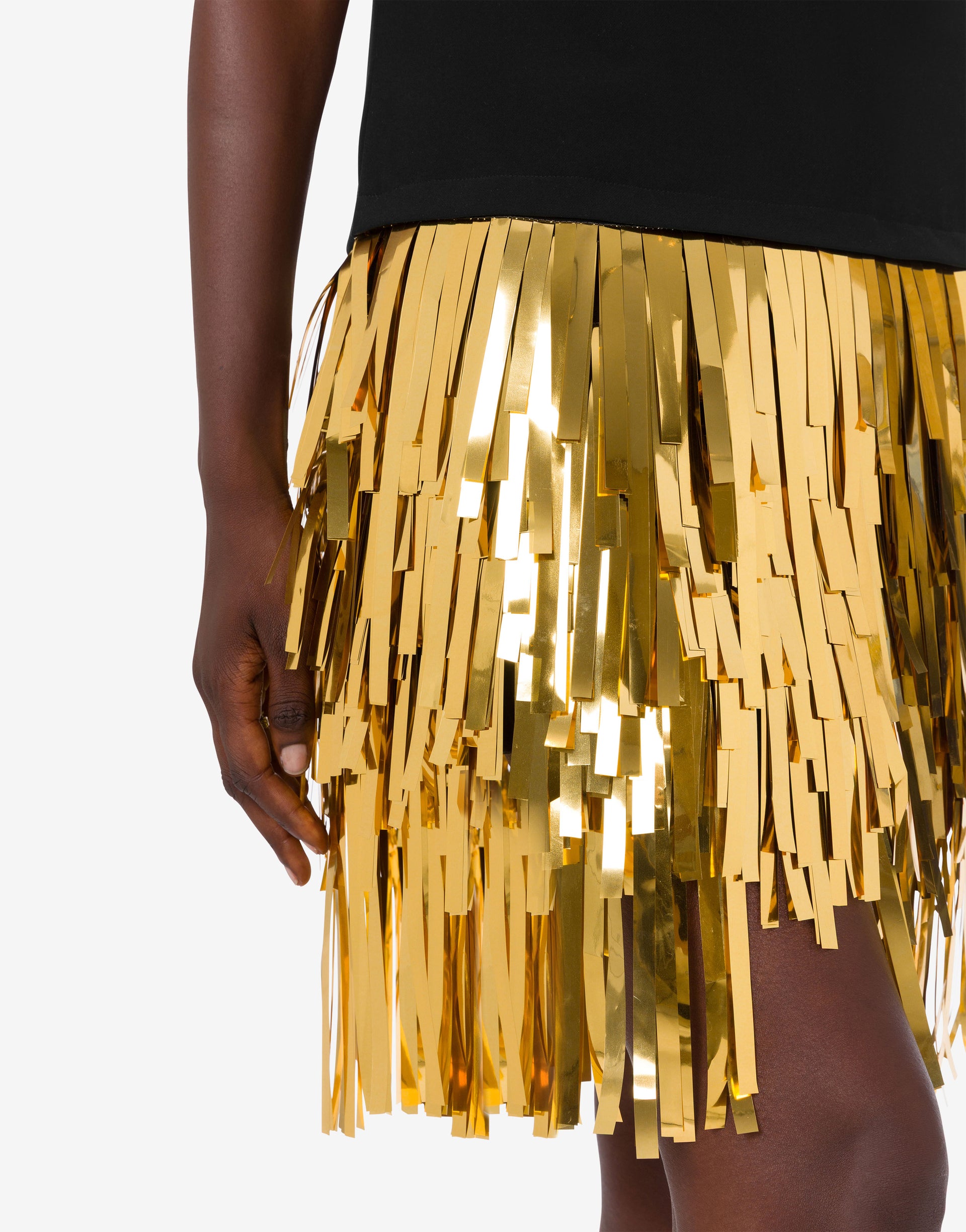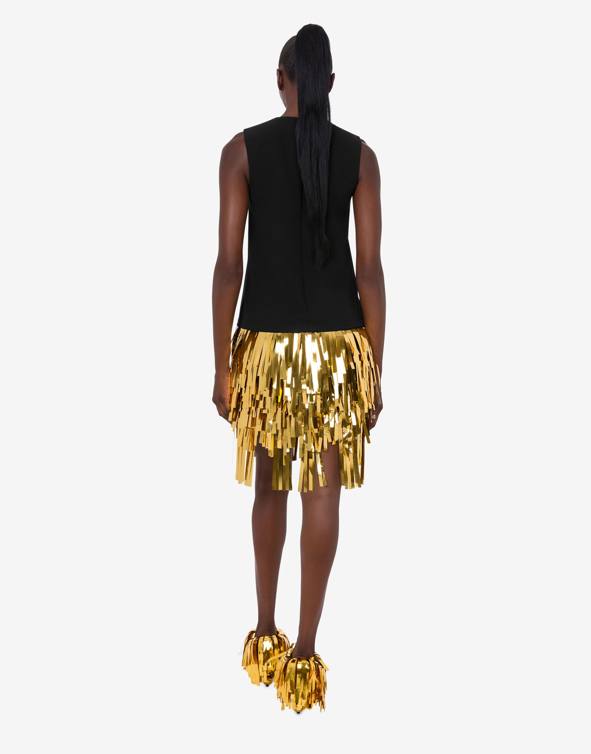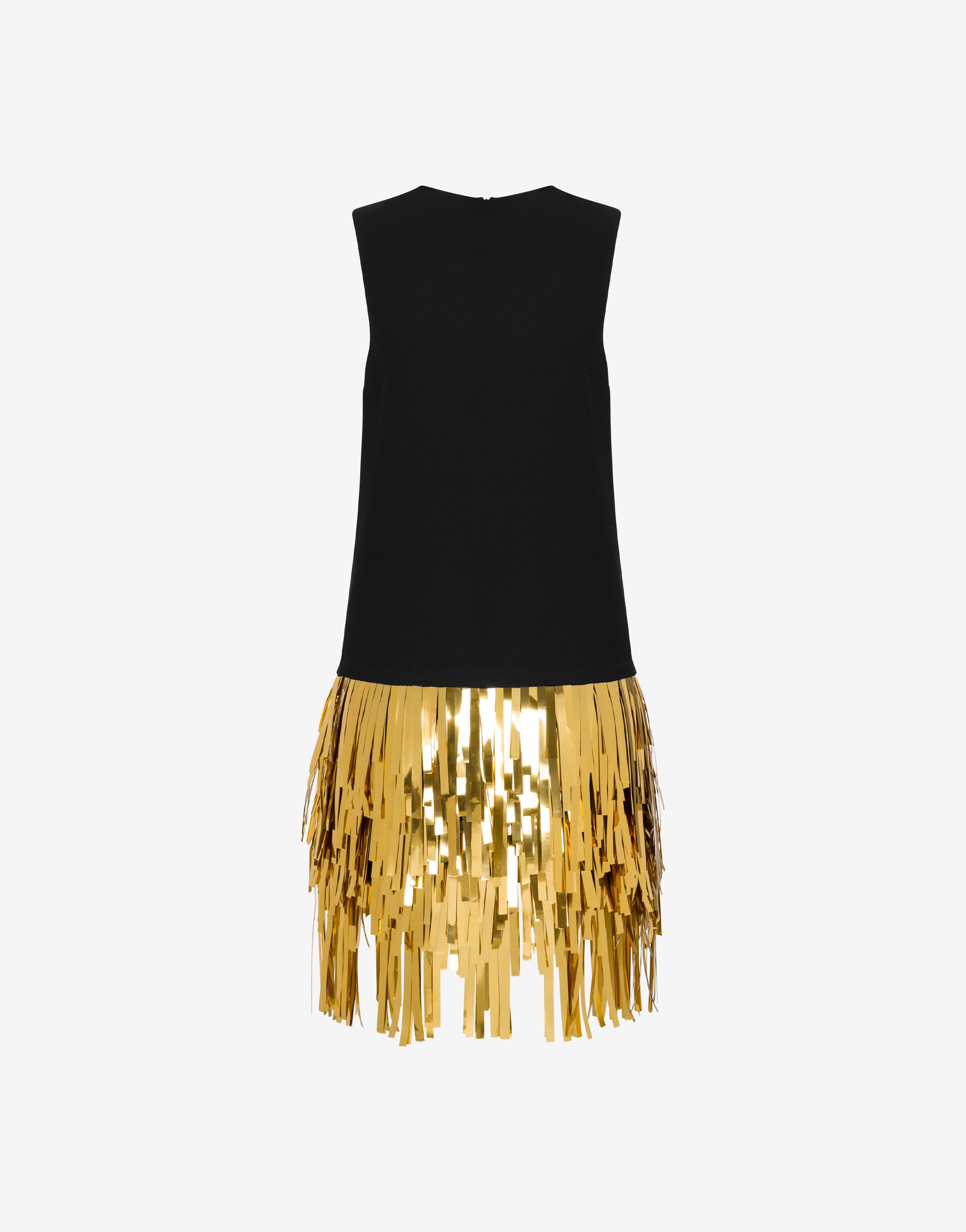 리조트 2026 컬렉션에서는 골드 미러 효과의 프린지가 돋보이는 짧은 스트레치 크레이프 드레스를 선보입니다.