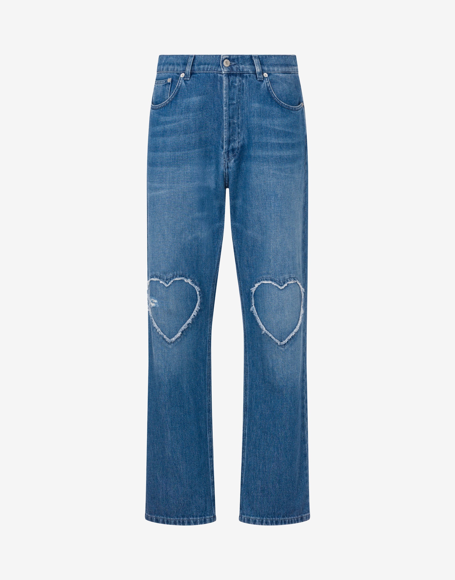 La collezione Primavera/Estate 2026 presenta il pantalone cinque tasche in denim blu di cotone con dettaglio a forma di cuore con bordi sfrangiati.