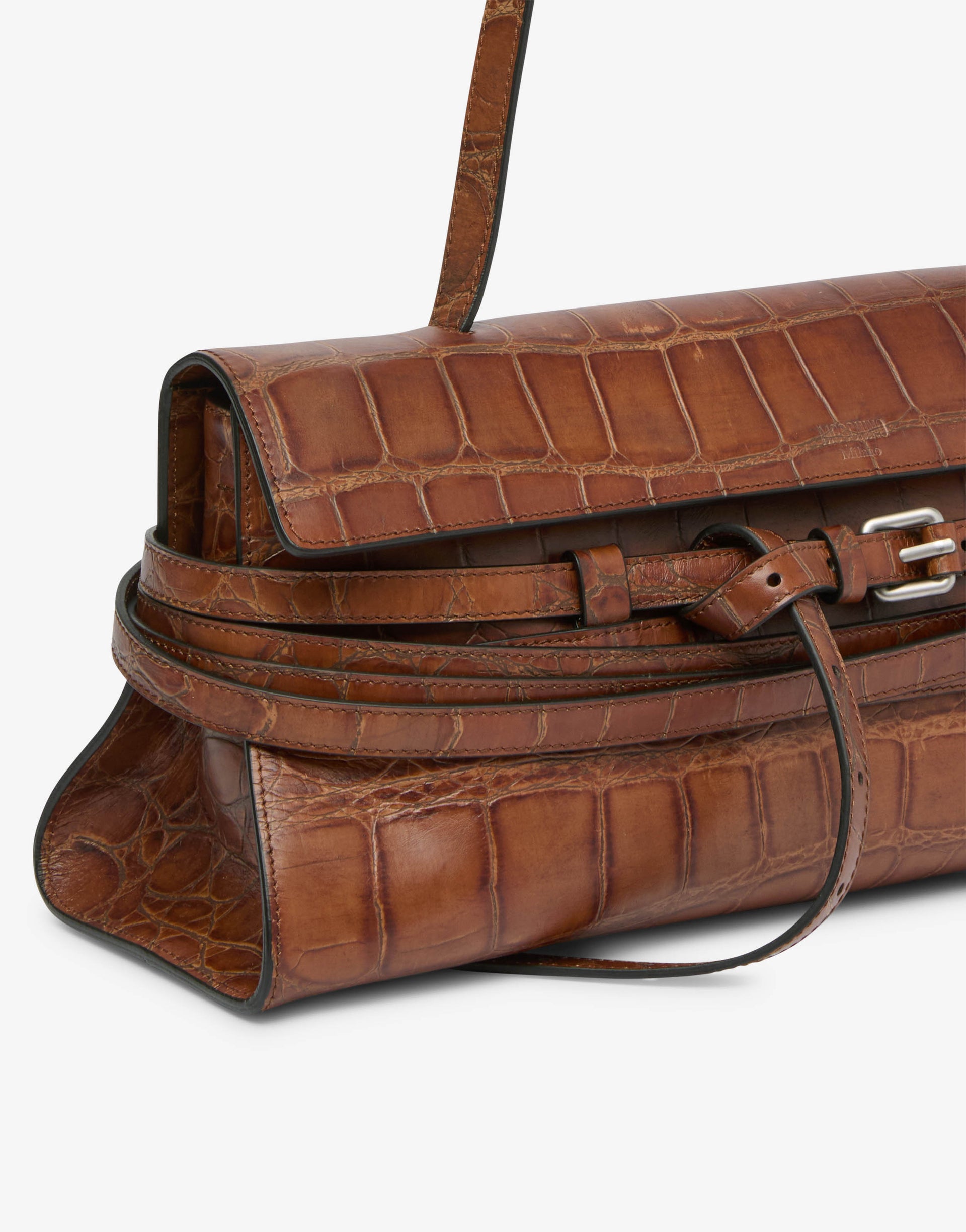 A coleção Primavera/Verão 2026 apresenta a bolsa de ombro com construção horizontal em couro envelhecido com estampa de crocodilo. A característica distintiva é a cinta decorativa, totalmente removível, que envolve o corpo da bolsa.