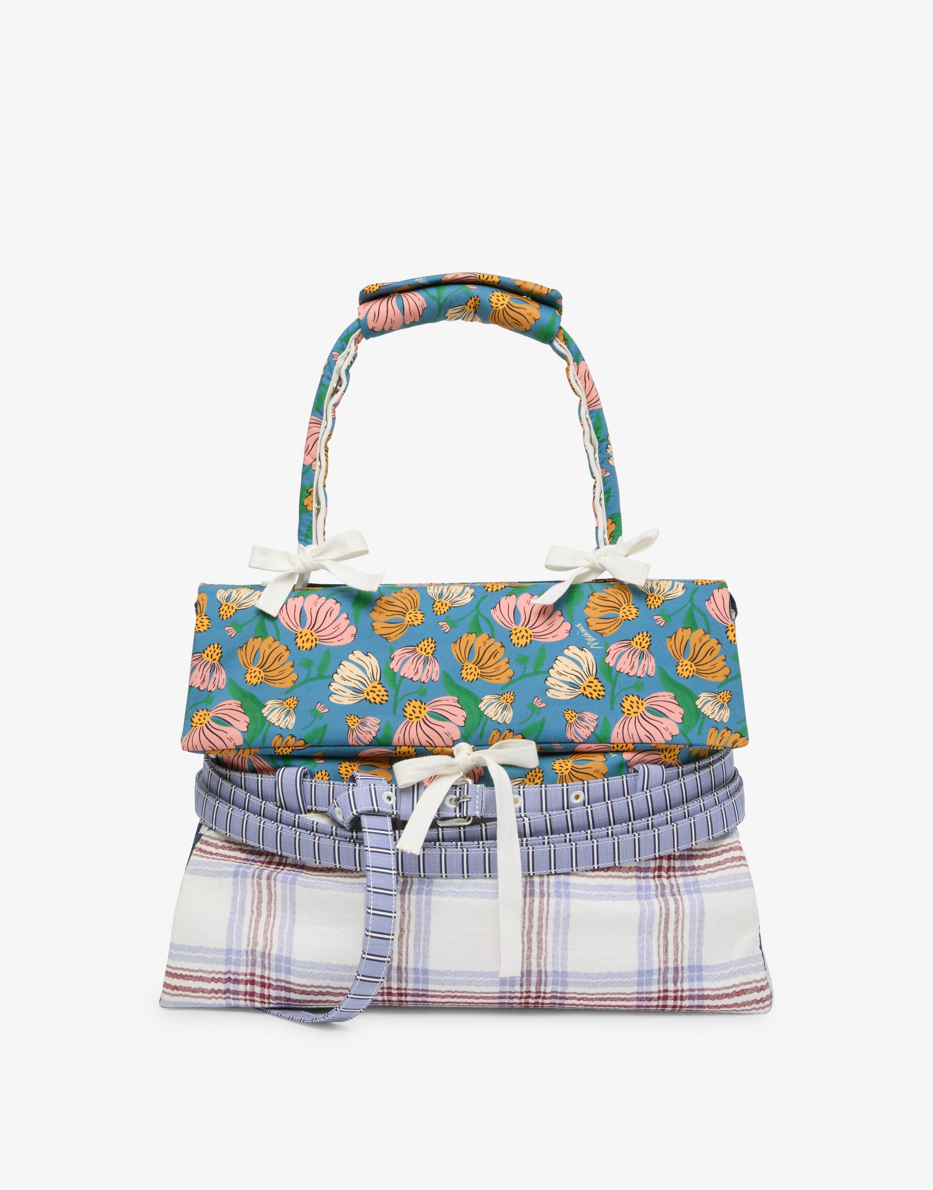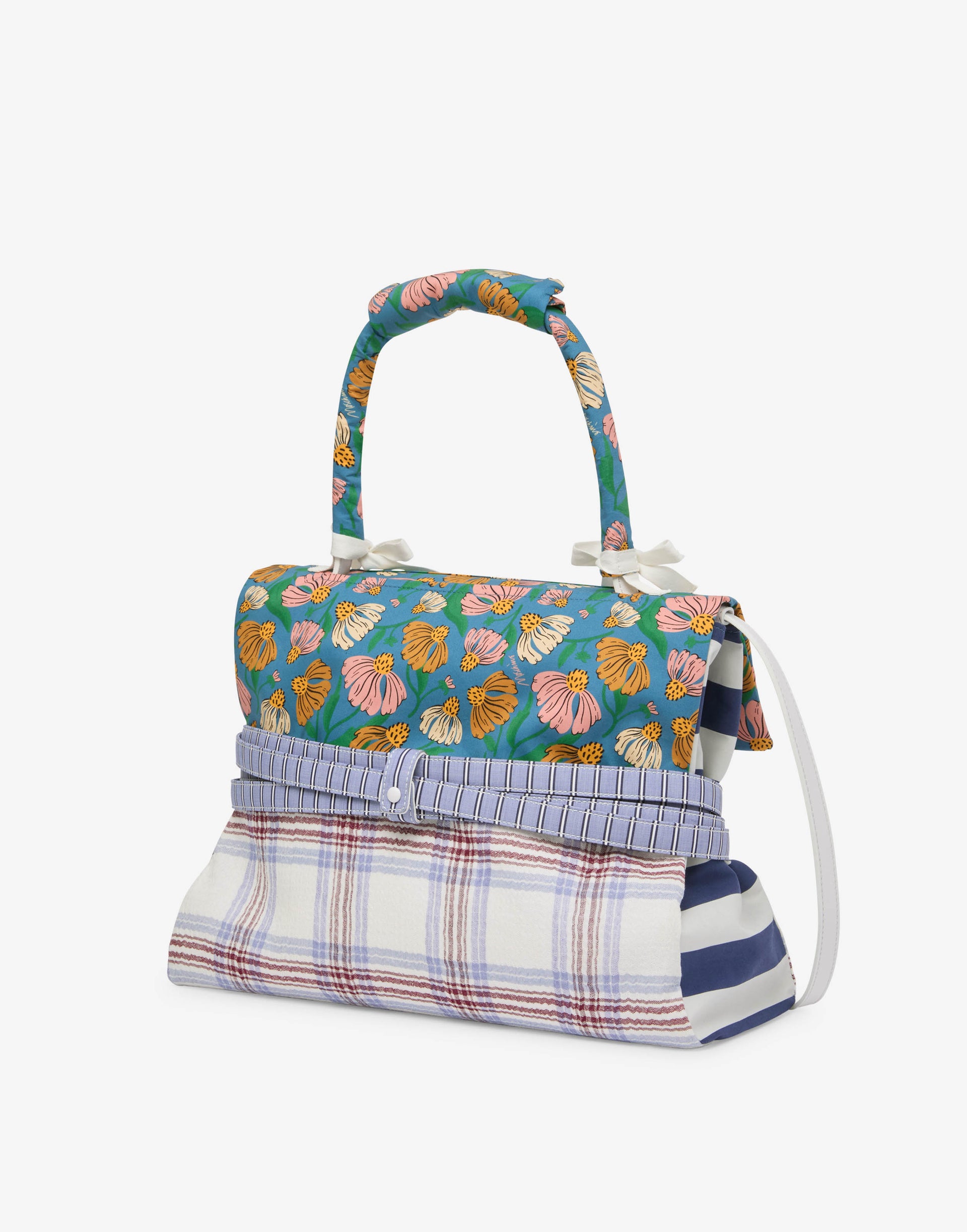 A coleção Primavera/Verão 2026 apresenta a bolsa de mão média em napa, enriquecida por uma capa removível em patchwork de algodão com padrão contrastante. A alça é revestida por um forro removível com botões de pressão. A característica distintiva é o cinto decorativo, totalmente removível, que envolve o corpo da bolsa.